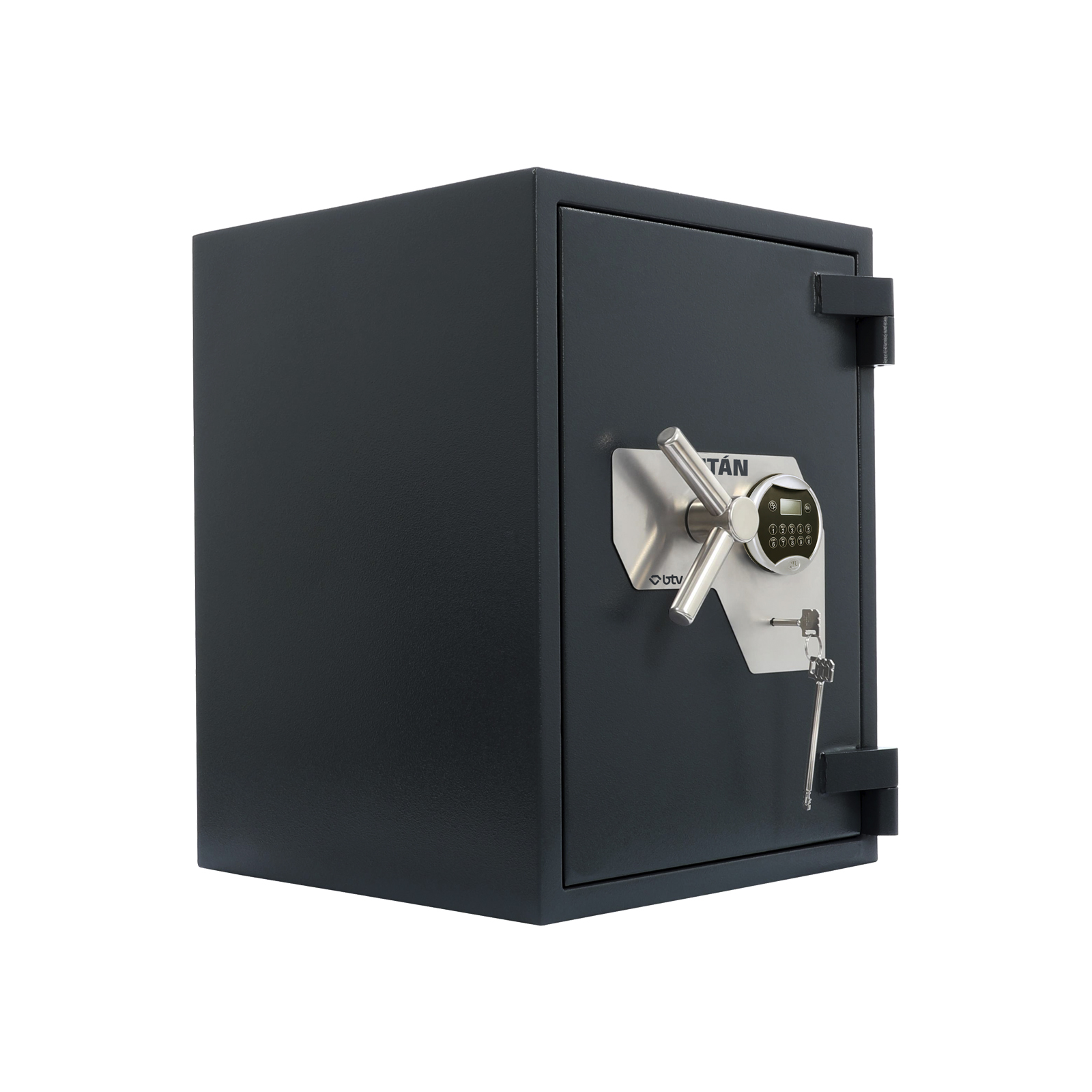 - Sistema de cierre: Cerradura electrónica de Certificación VdS Clase 2, B EN 1300 (ANSI UL-768 1R), con un código de usuario configurable de 6 a 8 dígitos. Retardo programable de 1 a 99 minutos, bloqueo con programación horaria, semanal y anual, y rebloqueo automático en caso de intento de acceso por la fuerza