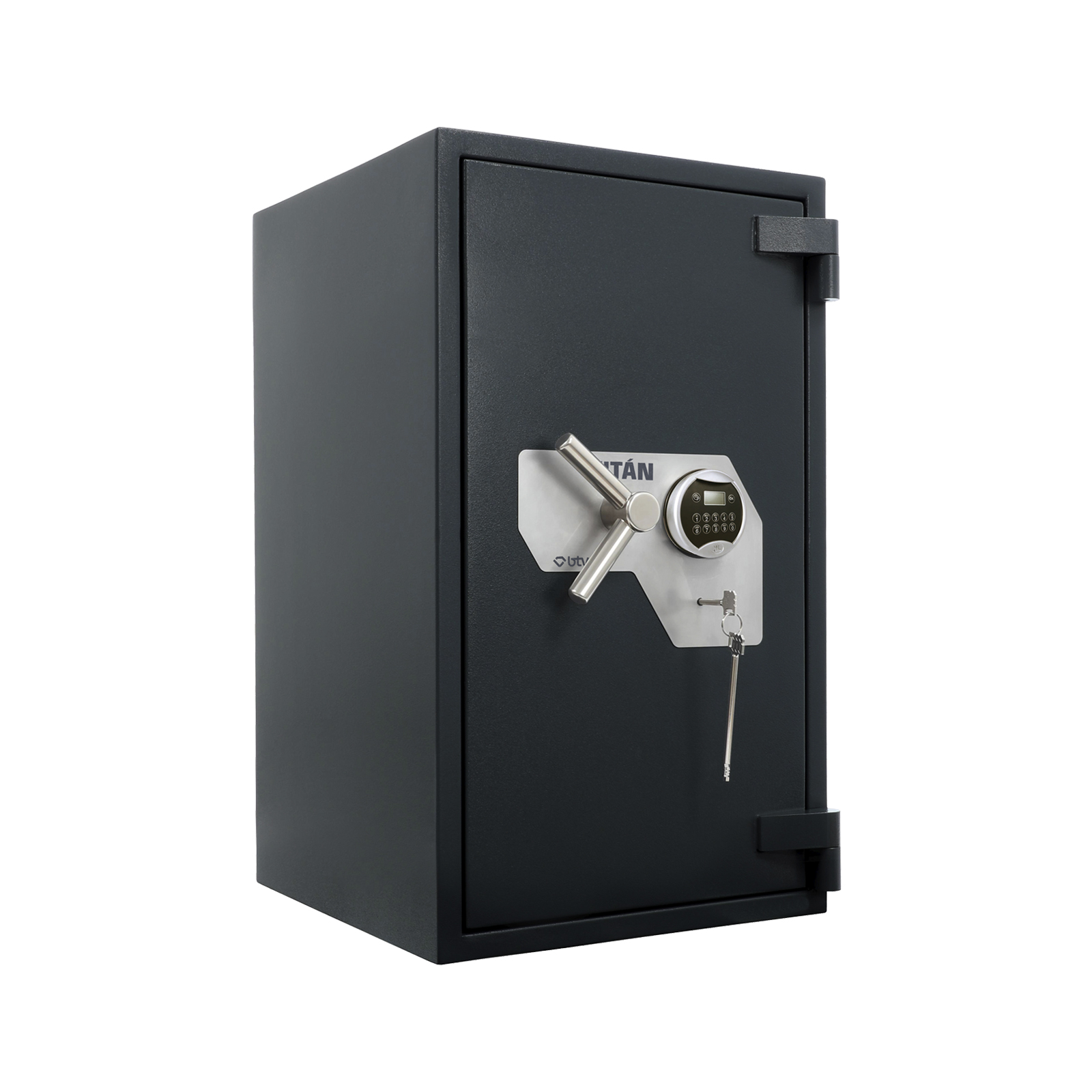 La caja fuerte Titán tiene bulones a los cuatro lados, teclado electrónico, cerradura de gorjas y maneta de apertura.